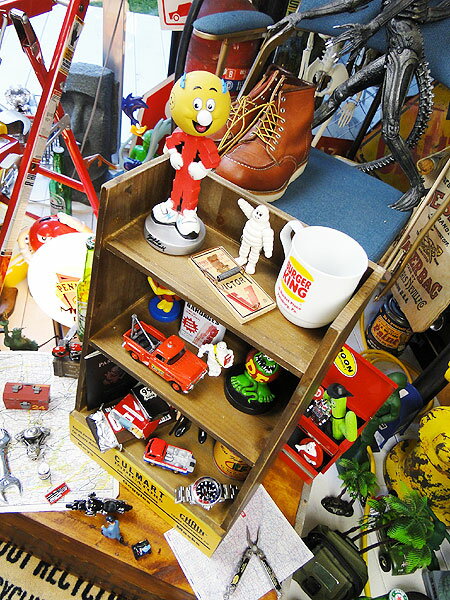 こういう小さいサイズの飾り棚ってありそうでないんだよね! ラックの一番下には50年代のアドバタイジングをイメージした看板になっていて、これがホント良い雰囲気を出してくれてるの! 棚はちょうどCDが収納できるサイズになっているので、デスク周りに置いておくと何かと便利なんです。