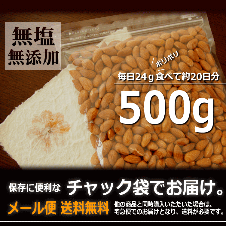 ■ 商品名 メール便 送料無料 国内加工 素焼きアーモンド(アメリカ産) 500gチャック袋 ■ 商 品 情 報 塩・添加物・油を使わない「素焼きアーモンド」です。